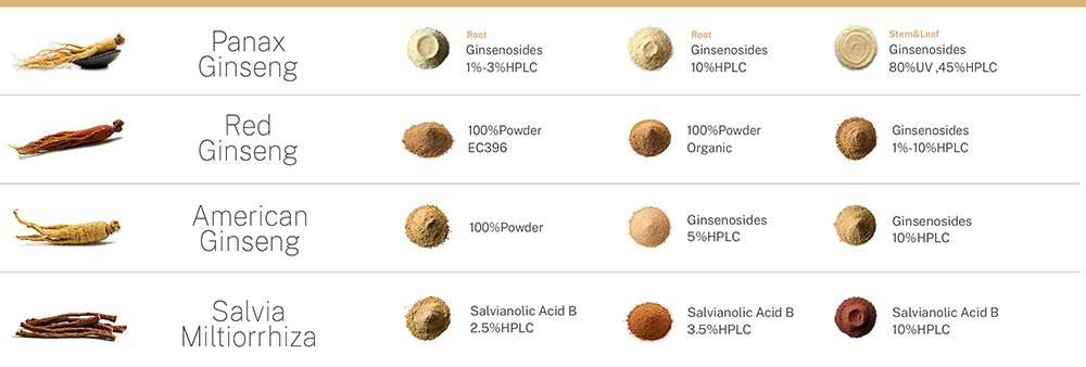 HoloPrime™ Ginseng Extract is a family of highly active components meticulously refined from the roots, stems, and leaves of ginseng, red ginseng, American ginseng, and other Panax species. It includes standardized extracts such as ginsenoside complexes, rare ginsenoside matrices, and polysaccharide essence clusters.